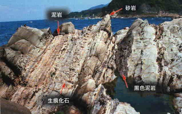 | 軍艦島の地層は、45゜以上北西に傾いています。砂岩は風化しにくく突出し、3〜4mの面を形成しています。一方、泥岩は浸食され凹んでいます。このような差別浸食は越前海岸では広く見られ、これが美しい海岸風景をつくる要因の一つになっています。 |