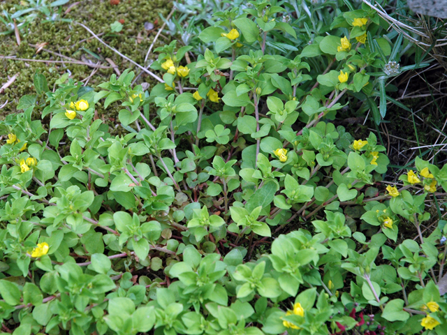 低地から山地の道ばたや草原に普通に見られる小型の多年草です。茎はななめに立つか地にねて、四方に広がります。葉は対生し、ほぼ卵形です。花は黄色で、葉のわきに1個ずつつきます。果実は球形で、まばらに長毛が生えます。種子は黒色で、密にこぶ状の突起があります。