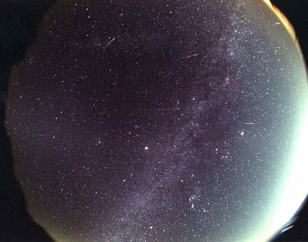 ● 撮影 2001年11月19日、03:06:10から25分20秒間露出 ● 撮影地 勝山市法恩寺林道 ● カメラ 自作全天カメラレンズ 対角線魚眼 16mm 絞りF3.4、ISO400ネガ