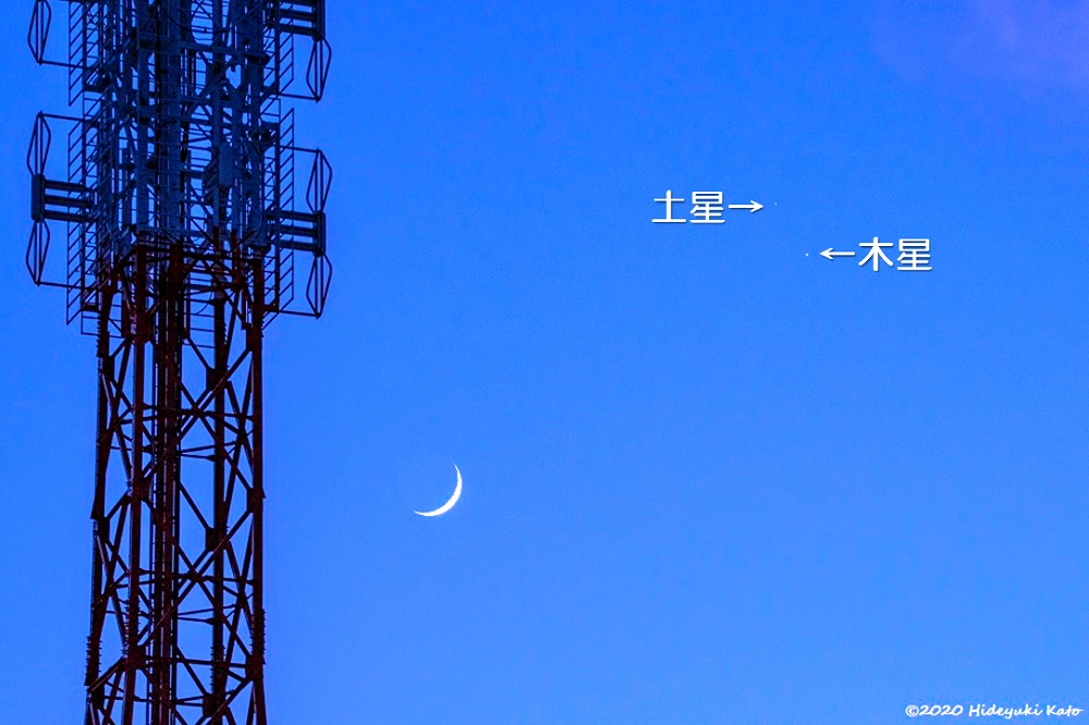 12月17日の夕方、西の空で三日月と木星、土星が近くに見えていました。この日の福井は雲が多く、見られた時間は僅かでしたが、見事な光景でした。