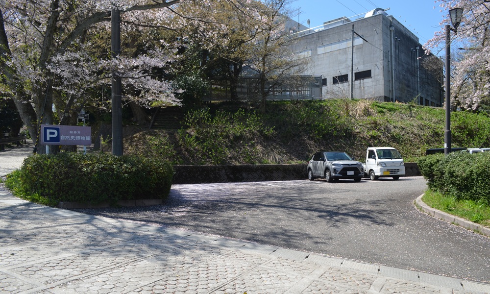 博物館の最寄の駐車場です。駐車場の少し先にある階段を上ると博物館があります。