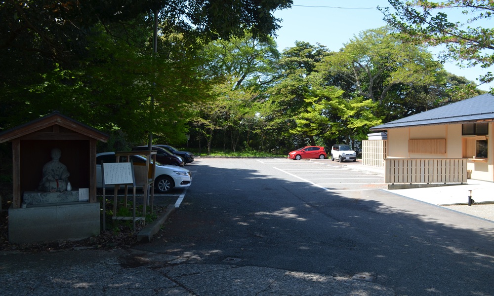 とは逆方向に道を下ると、階段坂の手前に駐車場があります。敷地内に喫茶店がありますが、公園駐車場として利用できます。博物館まで7分ほど坂と階段を上ります。