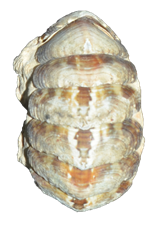 扁平で楕円形の体に、8枚の殻を被った姿をしています。海岸の岩場などに生息し、岩の表面の藻を削り取って食べます。